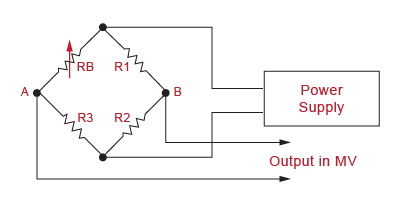 The two transverse gauges, shown as RB and R2, also change in resistance, but opposite in sense to the change of RI and R3.